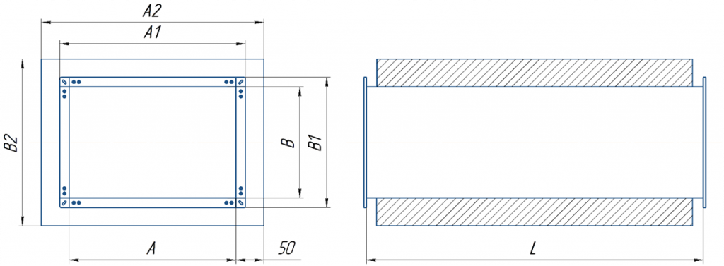 *По заявке рассматривается возможность изготовления шумоглушителей нестандартных размеров, но в пределах минимального (100х100 мм) и максимального (700х700 мм) размеров (АхВ), при длине (L) 600мм или 900мм (1000). Свыше максимального размера следует использовать шумоглушители типа ГП.
