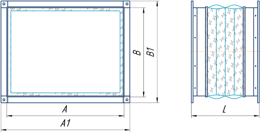 Примечание* Размер (длина вставки) изготавливается в двух исполнениях L=165мм/240мм . Размеры AxB соответствуют основным присоединительным размерам канальных вентиляторов прямоугольного сечения!